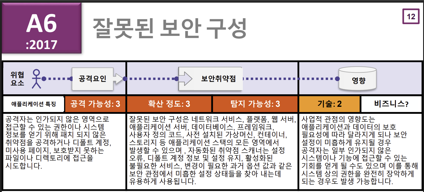 잘못된 보안 구성은 안전한 시스템을 구축하기 위한 모든 계층(네트워크, 플랫폼, 애플리케이션 서버, 프레임워크, 코드 등)에서 보안 설정이 누락되거나, 안전하지 않은 기본값을 그대로 사용하거나, 부적절하게 설정되었을 때 발생하는 취약점을 총칭합니다.