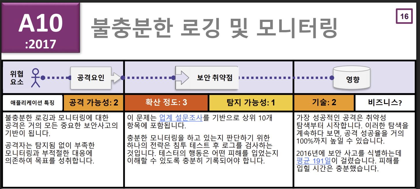 불충분한 로깅 및 모니터링은 애플리케이션에서 발생하는 중요한 보안 이벤트를 제대로 기록(로깅)하지 않거나, 기록된 로그를 아무도 적극적으로 감시(모니터링)하지 않아 공격을 탐지하고 대응하는 데 실패하는 취약점을 말합니다.