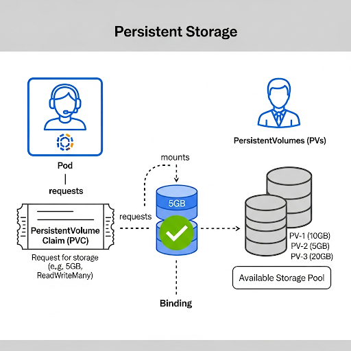 쿠버네티스는 이 '대출 신청서(PVC)'를 보고, 조건에 맞는 '책(PV)'을 찾아 서로 연결(Bind)해 줍니다. 이 과정을 통해 개발자는 복잡한 스토리지 인프라를 몰라도 필요한 만큼의 저장 공간을 할당받아 사용할 수 있습니다.
