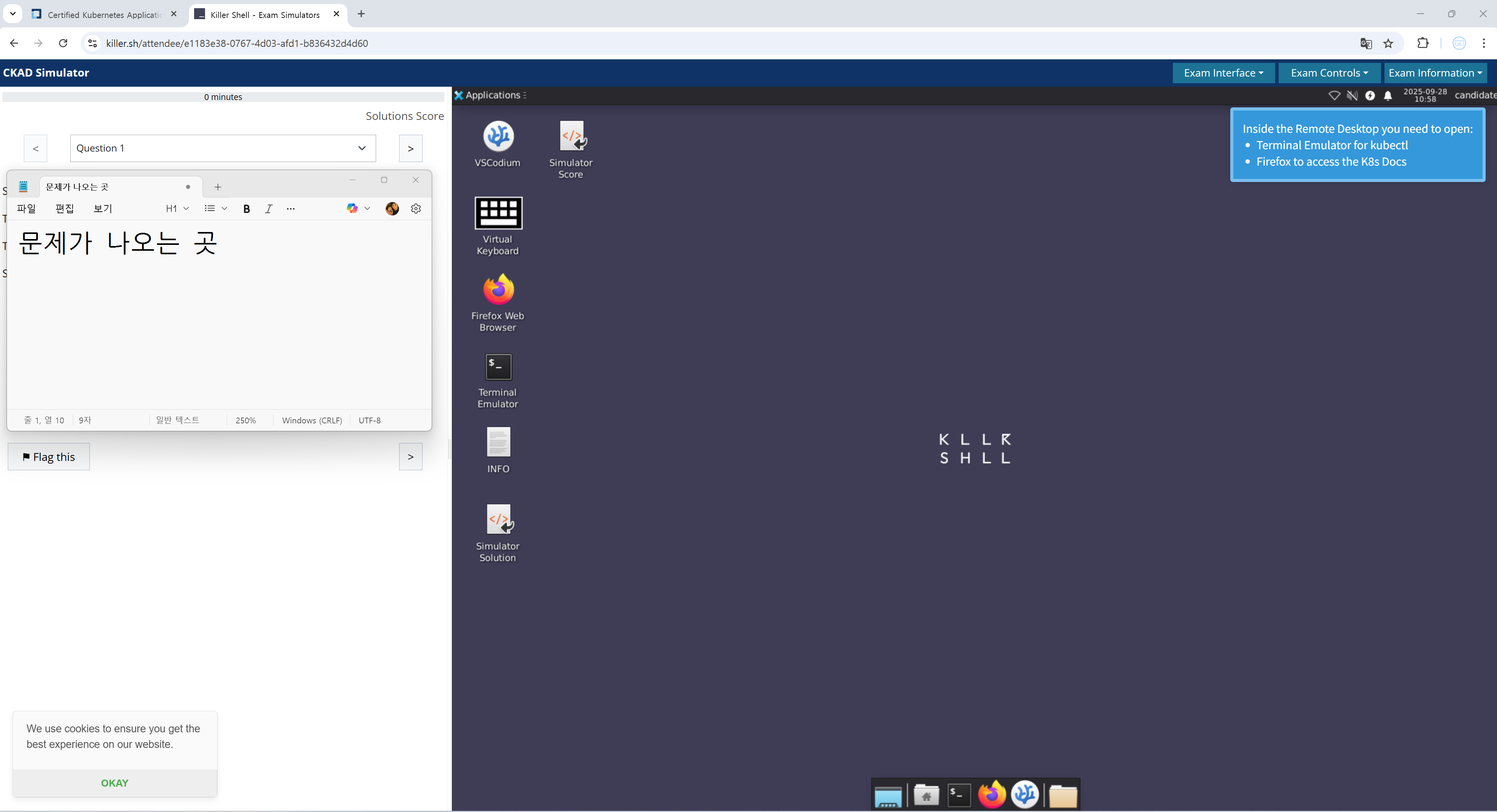 가장 중요한 것은 Killer.sh를 통해 새로운 환경에 충분히 적응하고 연습하는 것입니다. Killer.sh가 실제 시험 환경과 거의 100% 동일하게 제공되므로, 이곳에서 터미널과 브라우저 창을 자신에게 가장 편한 방식으로 배치하는 연습을 하고, 복사/붙여넣기 등 기본적인 조작에 익숙해지는 시간을 충분히 가지시길 바랍니다.