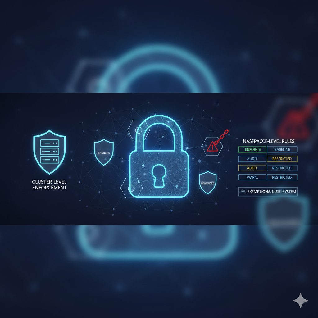 이 설정은 클러스터의 모든 네임스페이스에 기본적으로 baseline 정책을 강제하고, restricted 정책 위반 시에는 경고를 표시하도록 합니다. kube-system과 같이 쿠버네티스 시스템 컴포넌트가 실행되는 네임스페이스는 정책 적용에서 제외(exemption)하는 것이 일반적입니다.