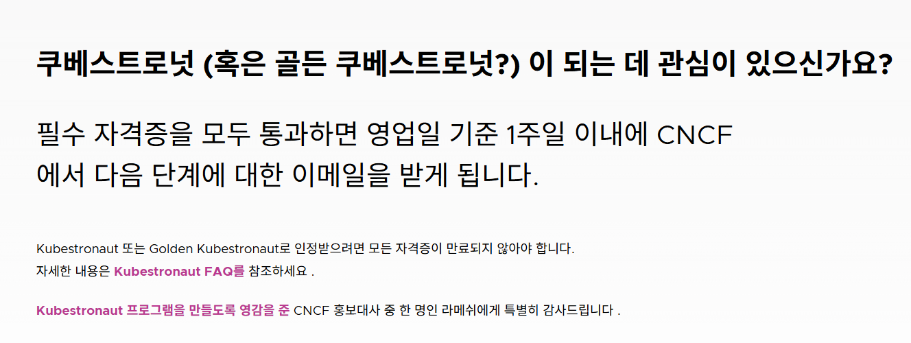 이번 CKS 합격으로, 저는 CNCF가 인정하는 '쿠버스트로넛(Kubestronaut)' 자격을 공식적으로 달성하게 되었습니다. CKA, CKAD, CKS, KCNA, KCSA까지 총 5개의 자격증을 모아 이룬 첫 번째 목표라 감회가 정말 새롭습니다. CKA를 취득한지 무려 6년만에 취득했네요. 물론 15개를 모두 모으는 '골든' 쿠버스트로넛까지는 아직 길이 멀지만, 큰 산을 하나 넘었다는 생각에 뿌듯함을 감출 수 없네요! 1주일 내로 메일이 온다니 받아서 등록해야겠습니다. 현재는 대한민국 기준으로 80명이 계시네요.