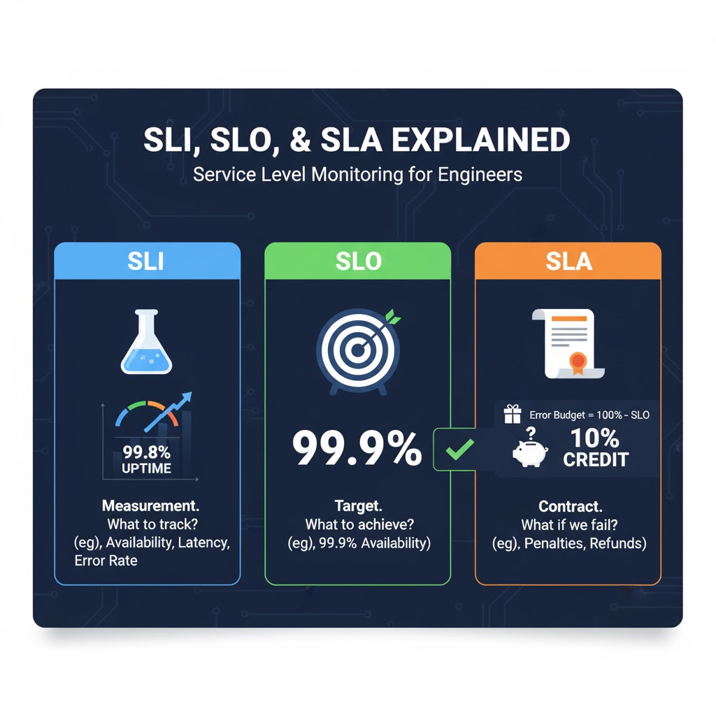 세 용어는 각각 따로 노는 개념이 아니라, 서로 끈끈하게 연결된 관계입니다. 서비스의 품질을 측정하고(SLI), 목표를 설정한 뒤(SLO), 고객과 약속(SLA)하는 흐름으로 이해하면 아주 쉽습니다. 자, 한 명씩 만나볼까요?