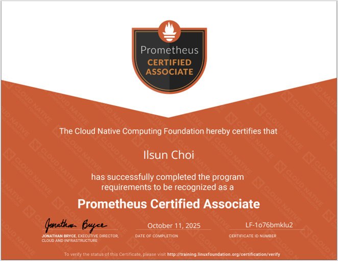 안녕하세요! '골든 쿠버스트로넛'이라는 원대한 목표를 향해 한 걸음씩 나아가고 있는 gasbugs입니다. CKS 합격으로 '쿠버스트로넛'이라는 첫 이정표를 달성한 지 얼마 지나지 않아, 곧바로 여섯 번째 관문인 PCA(Prometheus Certified Associate) 시험에 도전하고 짜릿한 합격 소식을 들고 왔습니다! 🥳