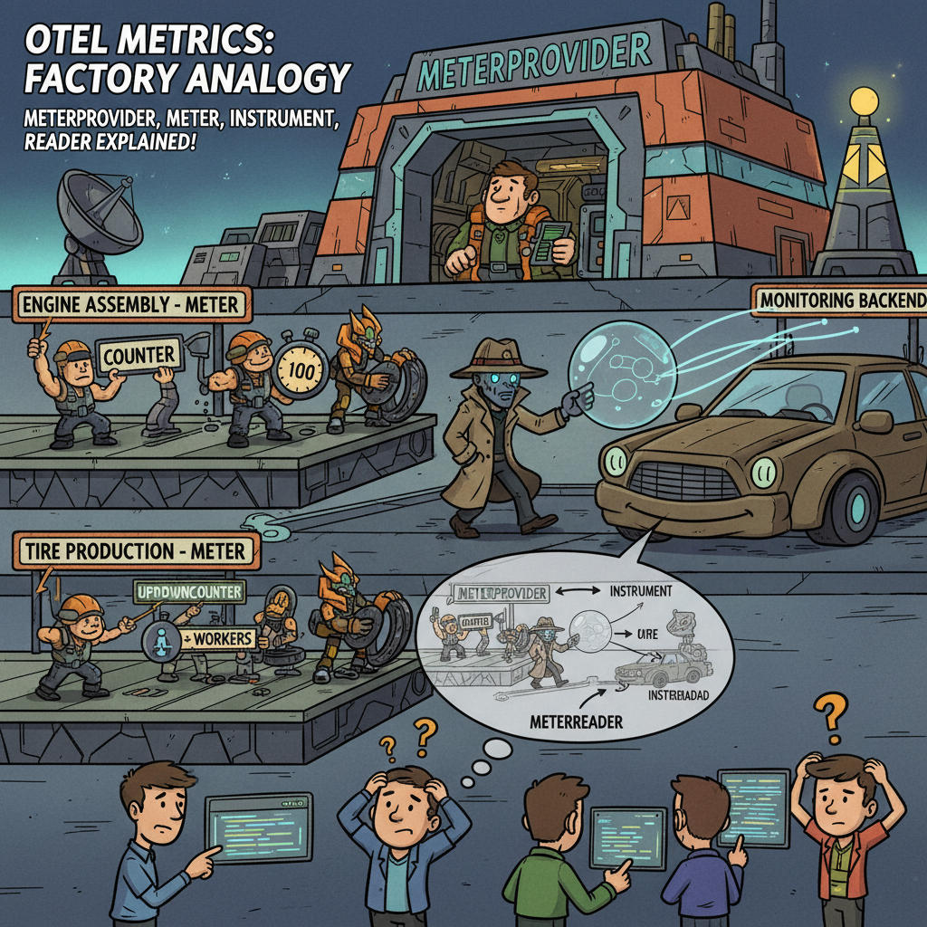 OpenTelemetry Metrics의 복잡한 구조를 하나의 거대한 '자동차 부품 공장'에 비유해 봅시다.