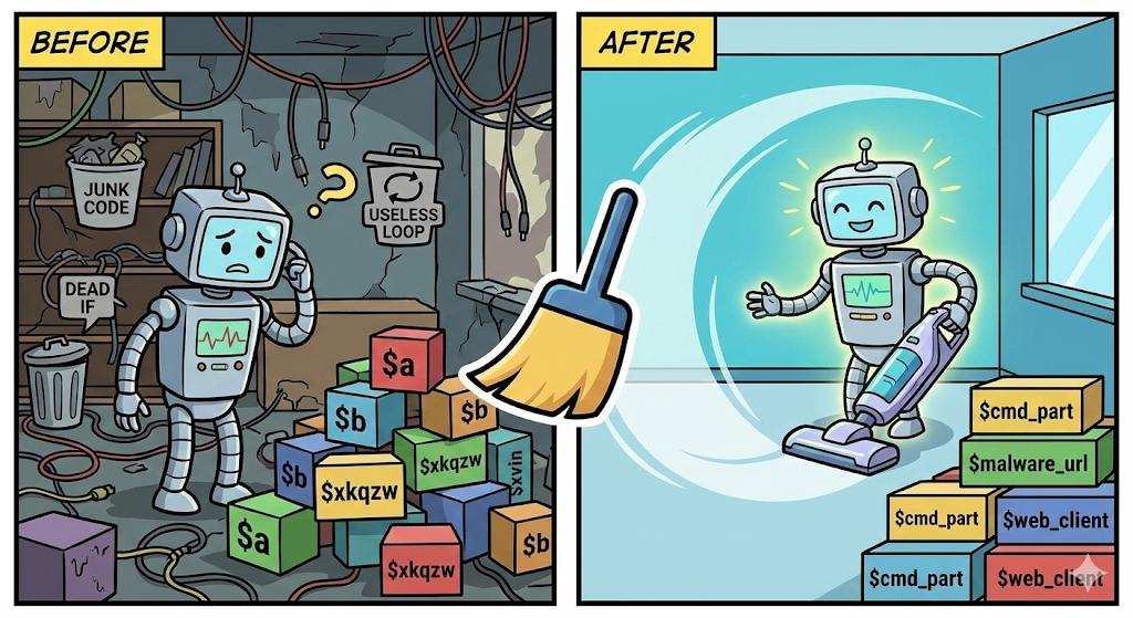 - 변수명 치환 (Renaming): $w_str, $x_val 같은 무의미한 변수명을 그 변수가 담고 있는 데이터나 역할에 맞춰 직관적인 영어 이름(예: $cmd_prefix, $c2_url)으로 변경하세요.