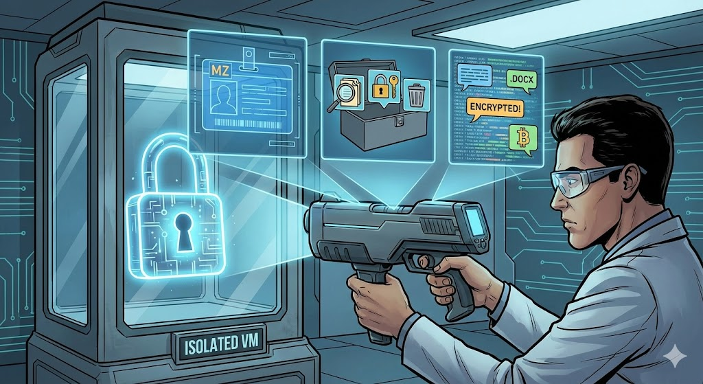 오늘은 조금 짜릿하고 위험한(?) 실습을 준비했습니다. 바로 실제(하지만 교육용으로 안전한) 랜섬웨어 샘플을 코앞에 두고 해부해보는 시간입니다.
