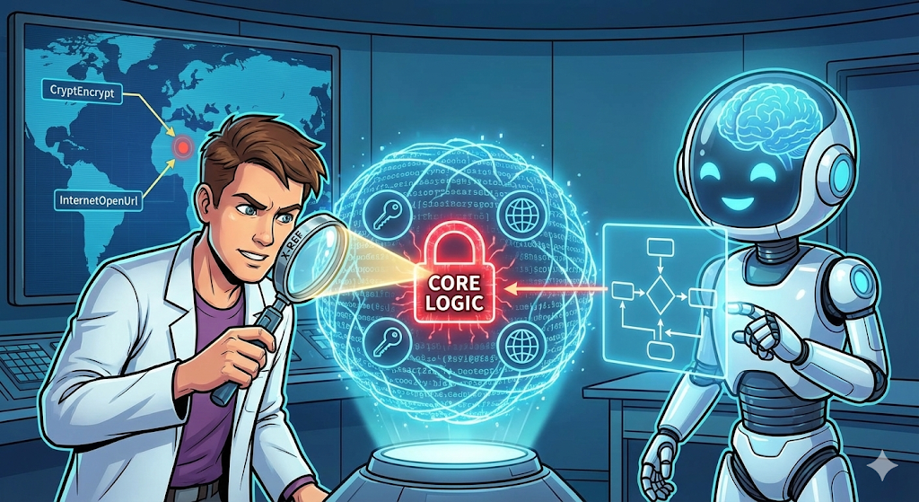 수만 줄의 어셈블리 코드 중에서 암호화 함수가 어디 숨어있는지 눈으로 찾으려면 밤을 새워도 모자랍니다. 이때 사용하는 치트키가 바로 상호 참조(X-Ref, Cross-Reference)입니다.