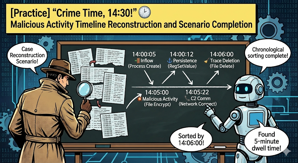 오늘은 AI를 활용해 복잡한 로그 데이터를 시간 순서(Timeline)대로 정렬하고, 이를 바탕으로 한 편의 영화 같은 '침해 사고 시나리오'를 작성하는 실습을 진행하겠습니다. 🎬
