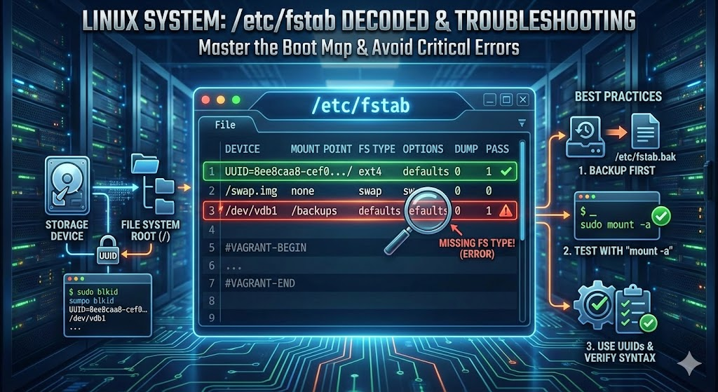 오늘은 실제 현업에서 사용되는(그리고 약간의 오류가 숨어있는!) /etc/fstab 파일 예시를 뜯어보며, 파일 시스템 마운트의 원리부터 실무 팁, 그리고 치명적인 실수 예방까지 완벽하게 정리해 드리겠습니다. 약 10분만 투자해서 이 파일을 정복해 보세요!