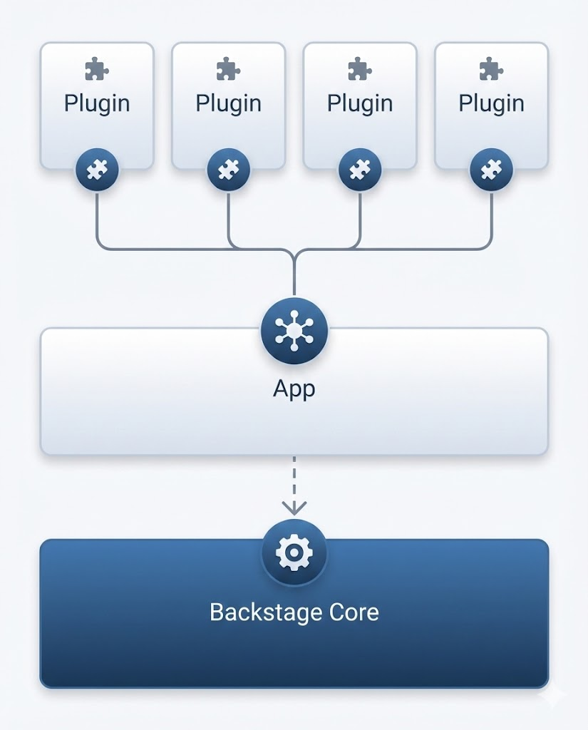 - 코어 (Core): Backstage 메인 팀이 관리하는 오픈소스 기반 코드입니다. 시스템의 뼈대 역할을 합니다.