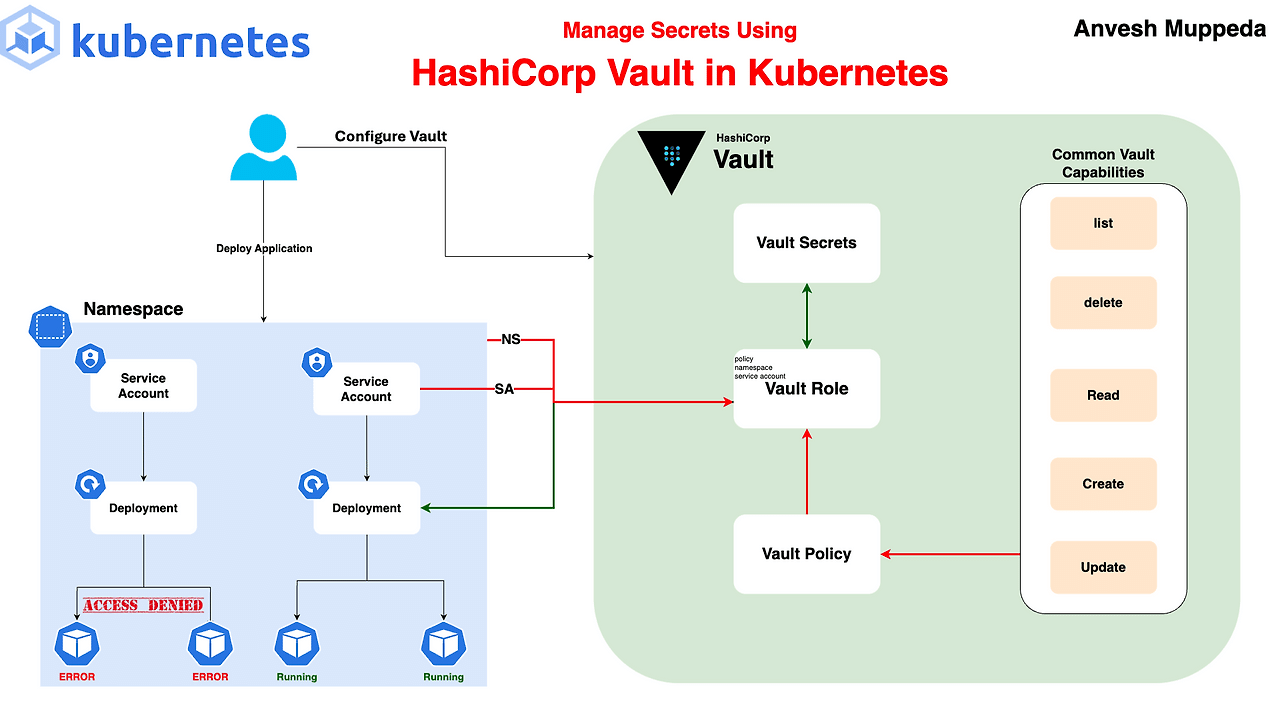 전체적인 흐름은 쿠버네티스의 '서비스 어카운트(Service Account)'를 애플리케이션의 신원(Identity)으로 사용하여 볼트(Vault)에 인증하고, 미리 정의된 정책(Policy)에 따라 필요한 비밀 정보에만 접근 권한을 부여하는 것입니다.