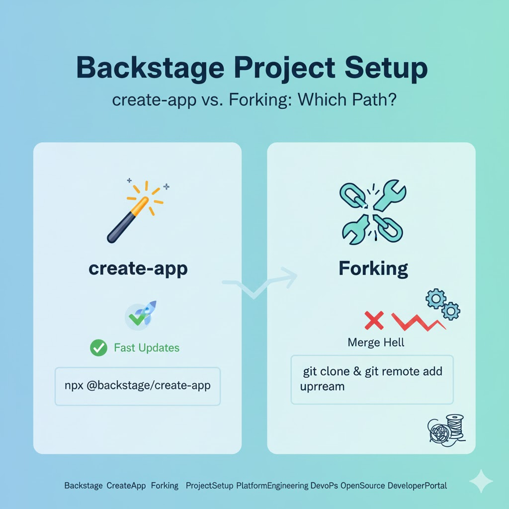 Backstage는 단순히 다운로드해서 설치하는 소프트웨어가 아니라, 여러분의 조직에 맞게 구축하는 프레임워크입니다. 이때 npx @backstage/create-app을 사용하는 방식과 메인 레포지토리를 Fork하는 방식 중 무엇을 선택하느냐가 향후 운영의 운명을 결정합니다. 💡