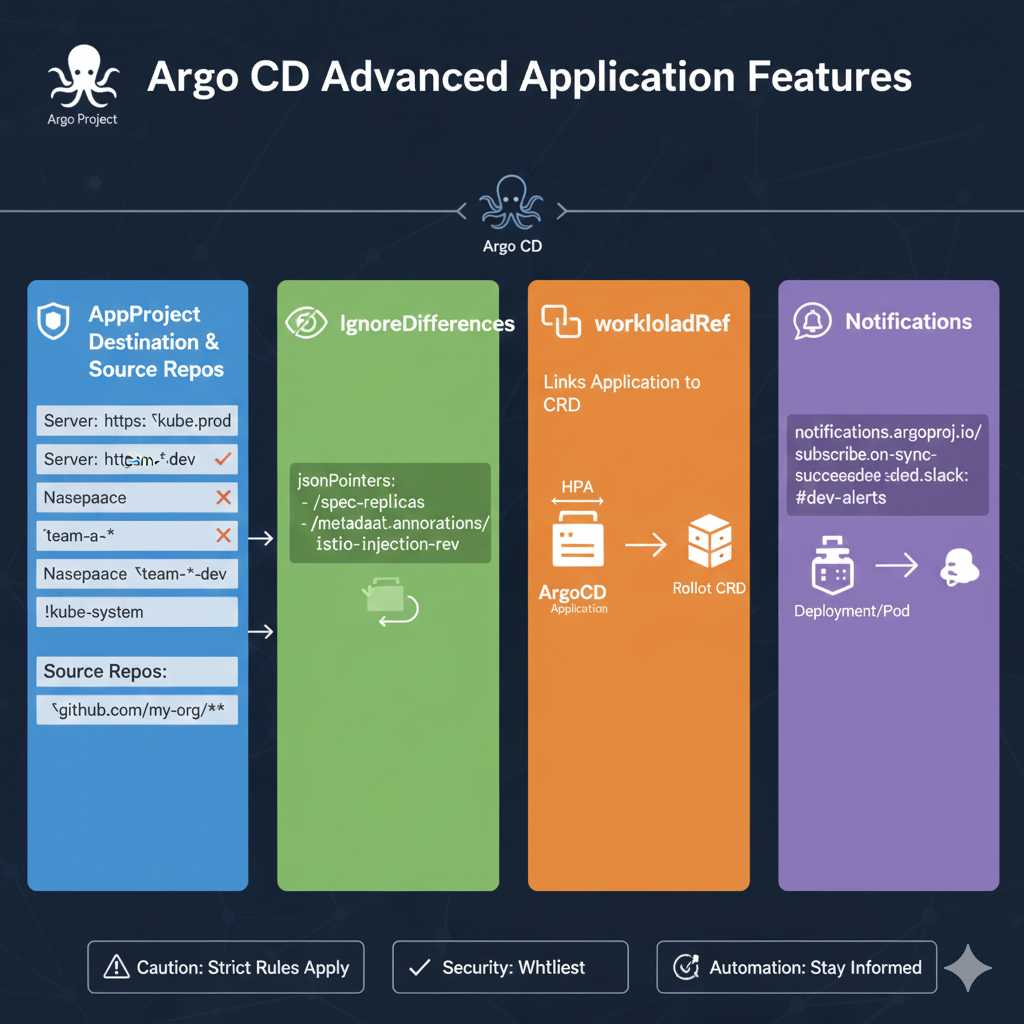 오늘은 질문 주셨던 AppProject의 Destination 규칙에 대한 오해를 바로잡고, Argo CD의 고급 기능들인 workloadRef, sourceRepos, ignoreDifferences, 그리고 Slack 알림 설정까지 실무에서 바로 써먹을 수 있도록 아주 깊이 있게 정리해 보겠습니다! 🚀