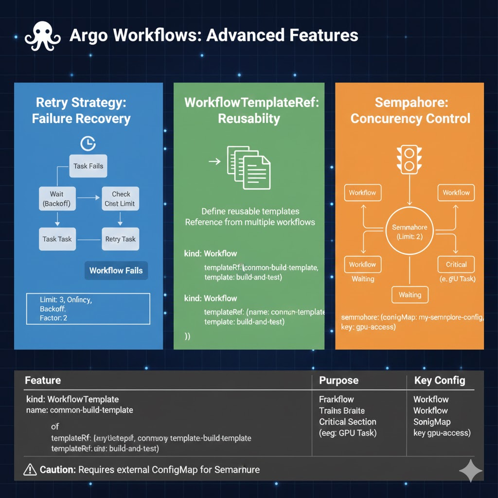 Argo Workflows의 retryStrategy, WorkflowTemplateRef, Semaphore는 각각 실패에 대한 회복탄력성, 개발 효율성, 그리고 자원 관리 효율성을 극대화하는 핵심 기능들입니다. 이 기능들을 적재적소에 활용하면 여러분의 워크플로우는 훨씬 더 안정적이고, 유연하며, 비용 효율적으로 운영될 수 있을 것입니다.