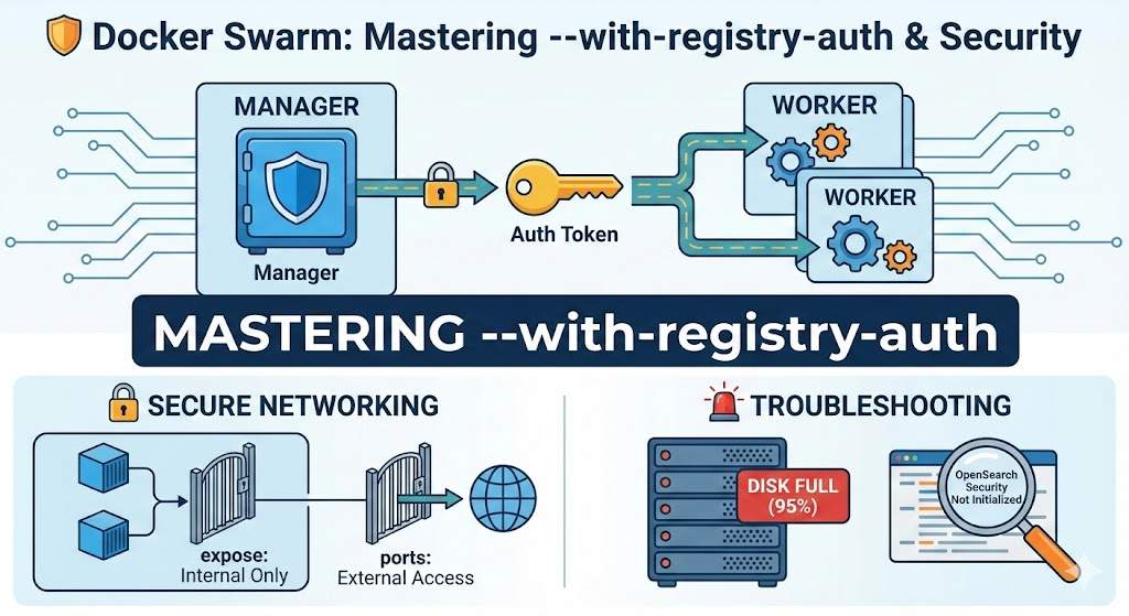 도커 스웜은 쿠버네티스에 비해 가볍고 강력한 도구입니다. 하지만 --with-registry-auth와 같은 옵션의 의미를 정확히 모르면 운영 중 예상치 못한 장애(Image Pull Error)를 겪게 됩니다.