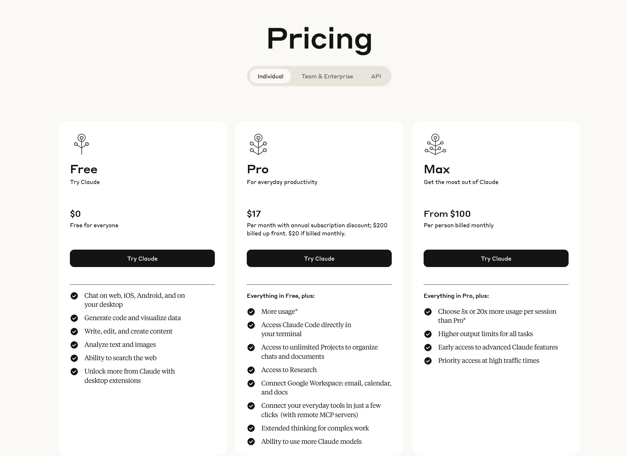 | Max | $100 / $200 | Pro 대비 5배 / 20배 사용량을 제공하는 파워 유저용 플랜 |